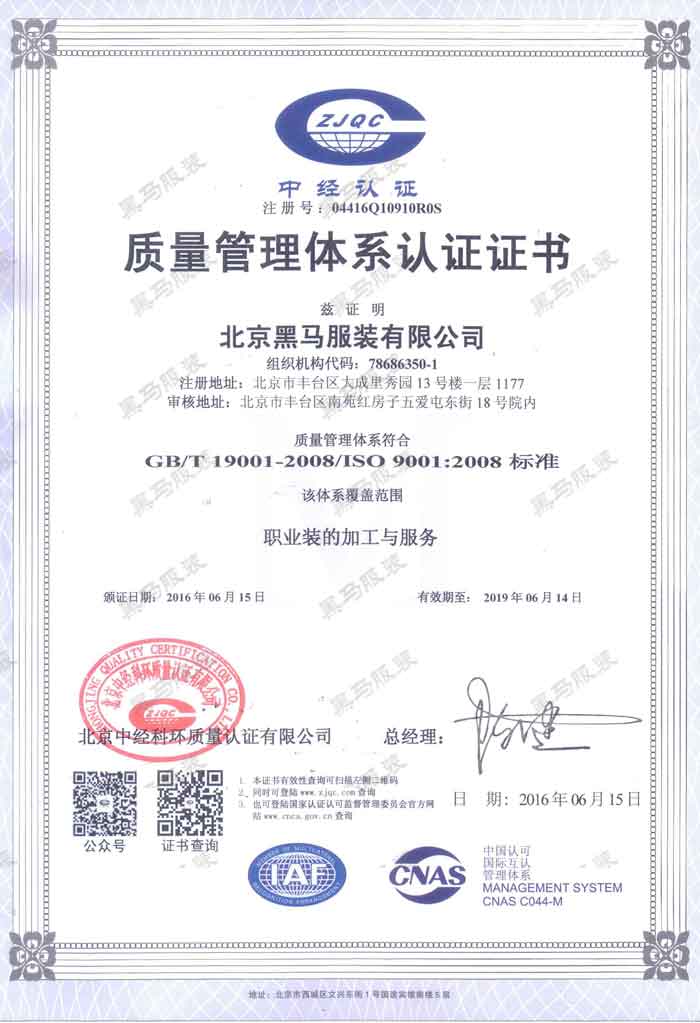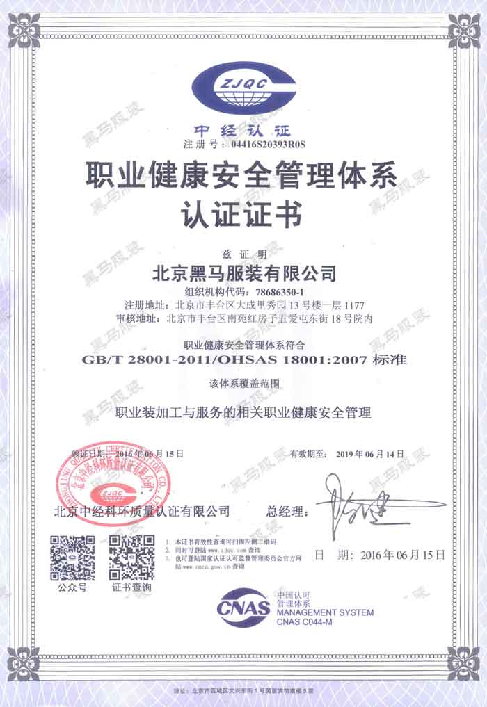公司先后通過ISO9001國際質量管理體系認證、ISO14001國際環境管理體系認證和GB/T28001國際職業健康安全認證,是北京為數不多的全部通過三標認證的服裝生產企業。
